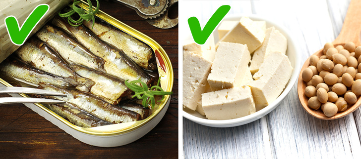 Sources of calcium: sardines and canned salmon, soybeans and tofu, almonds, cheese, milk, spinach, and orange juice.