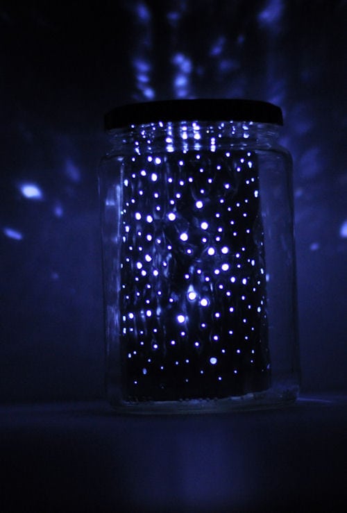 This project involves first spray painting your jar a light blue ombre color with some sparkles. An LED light is glued to the lid.