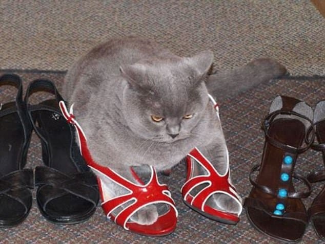 Is this cat wearing these stylish red stilettos, or are they wearing him?