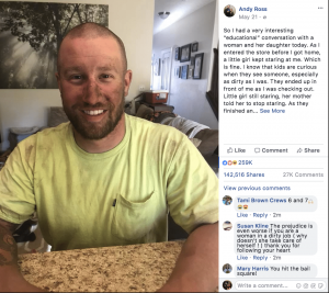 “So I had a very interesting ‘educational’ conversation with a woman and her daughter today. As I entered the store before I got home, a little girl kept staring at me. Which is fine. I know that kids are curious when they see someone, especially as dirty as I was,” he explained.