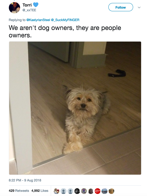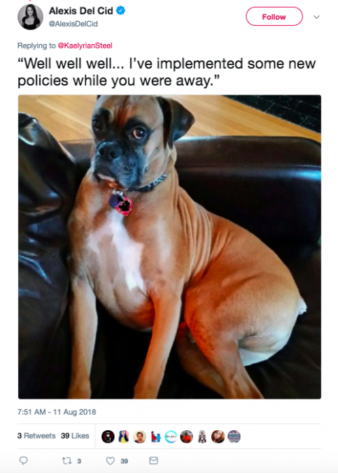 The policies include but are not limited to: I am now allowed on the couch whenever I want, I bark, you give me a treat, and you let me smell your breath at least six times a day.”