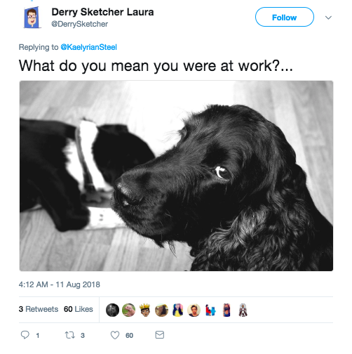 The expression on this dog’s face is priceless. It says, “Oh, you were ‘at work’? Likely story.”