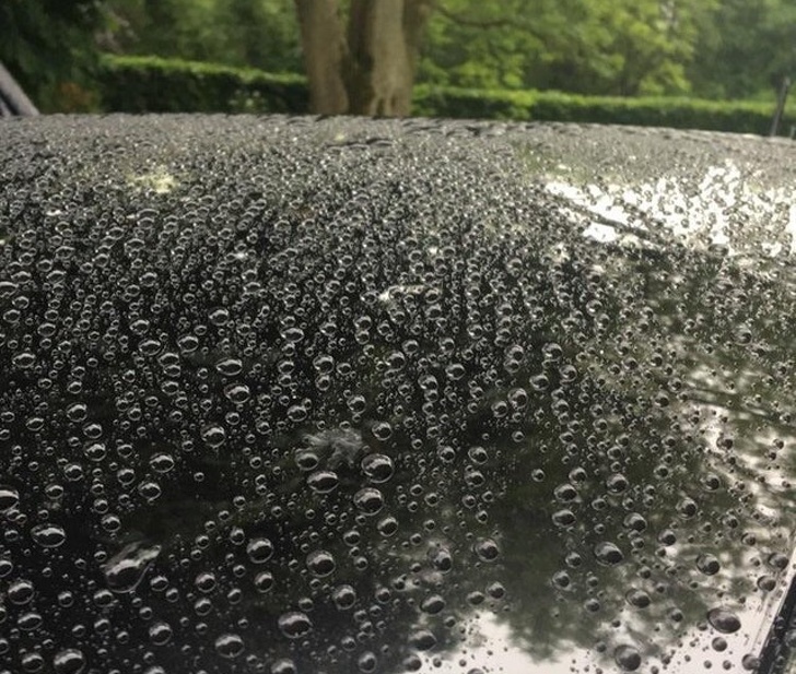 Gotas de lluvia suspendidas sobre la pulida superficie de un automóvil