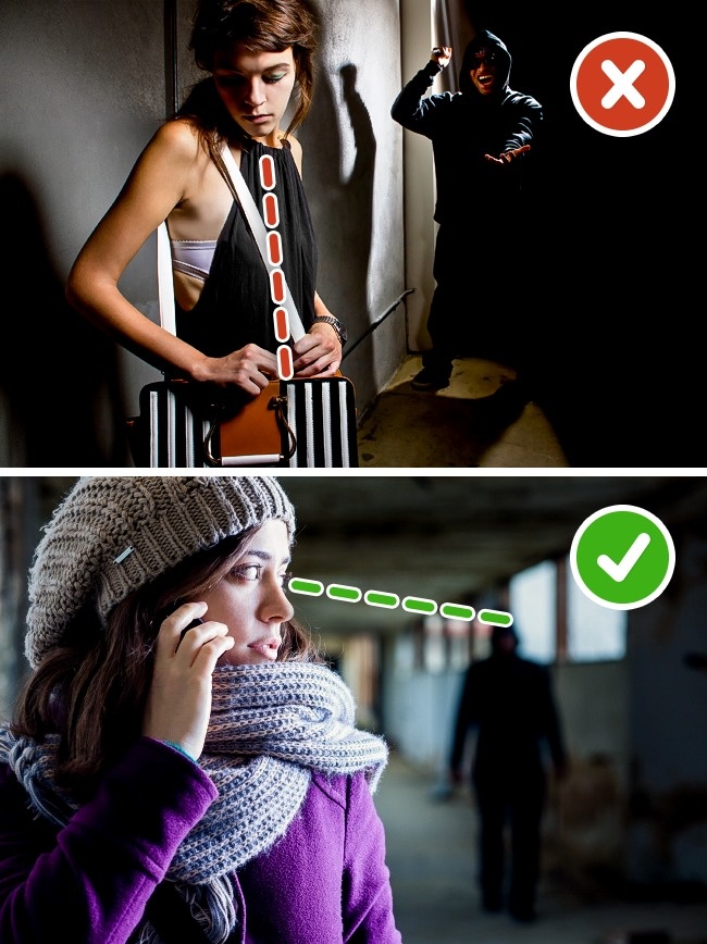 People tend to instinctively lower their head and increase their pace when they sense danger. However, you should do just the contrary: confidently raise your chin, and slow down.