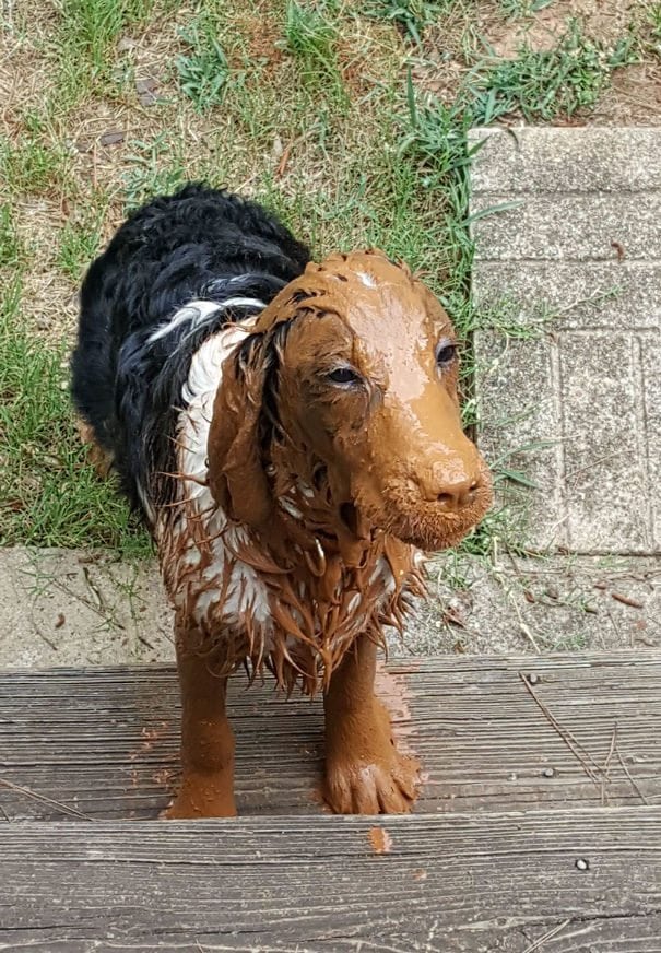 Pup, we sincerely hope that’s just mud you’re covered in.