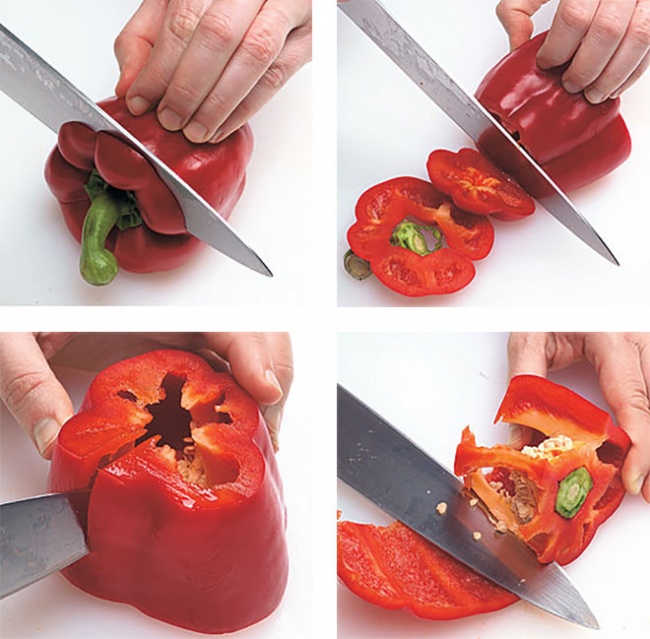 Start by topping and tailing your bell pepper, and then run your knife along the inside of the flesh.