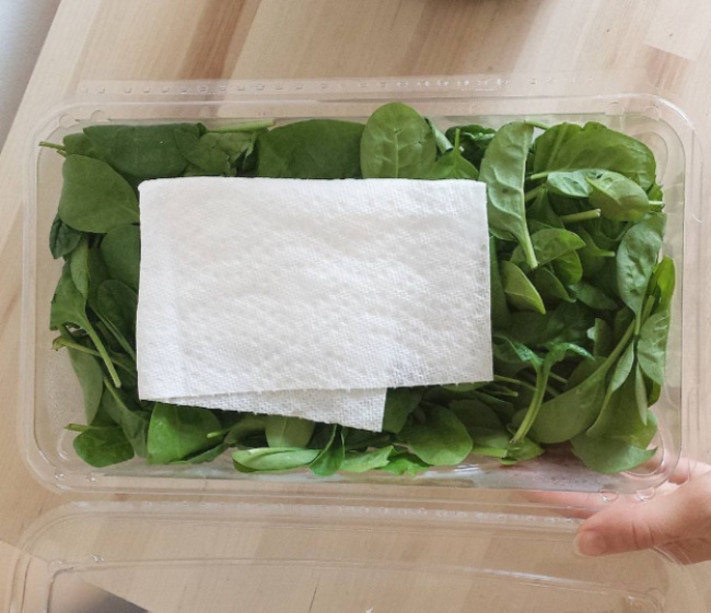 Simply cover your salad greens with a paper towel and leave for a while. The towel will absorb the excess moisture and help keep your leaf vegetables from rotting quickly.