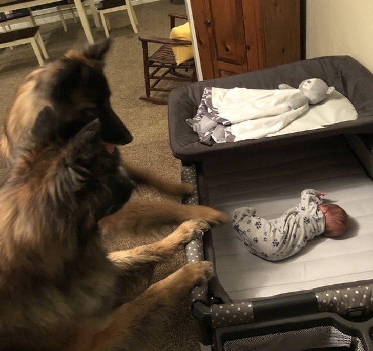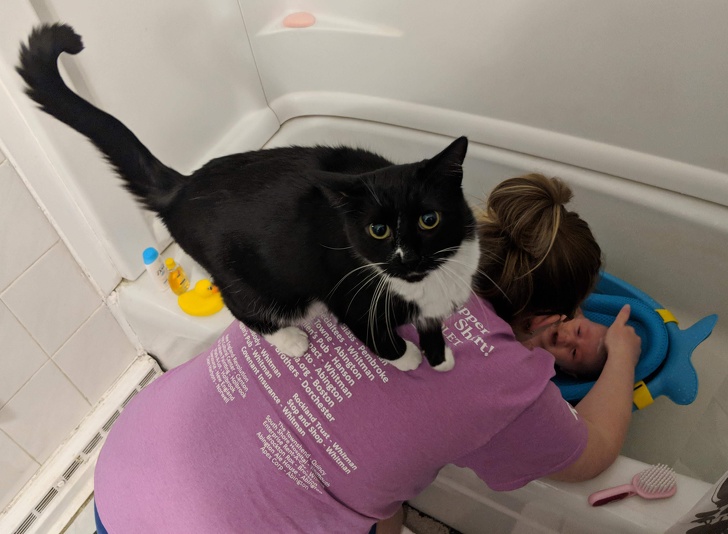 “Our cat is very protective of our newborn. She does not approve of her getting a bath.”