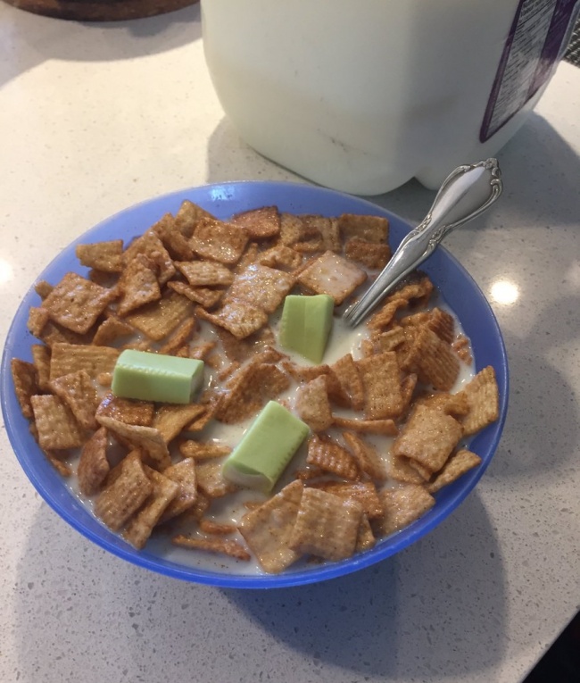 Made my kid put green apple Japanese Hi-Chews on his Cinnamon Toast Crunch because fruit.