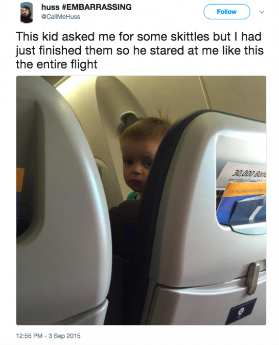 Look, if you don’t share your Skittles, you deserve to get stared at by a demon baby for the entirety of your flight.