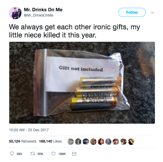 Do you know how many people you could cover if you just gave everyone a few batteries?! You can even use old ones! They don’t have to work. It’s the joke that counts.