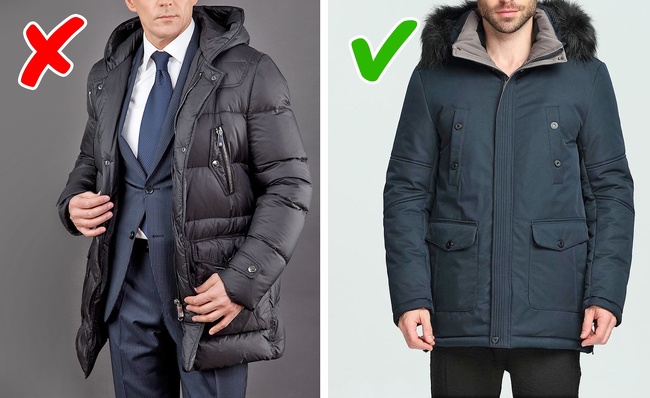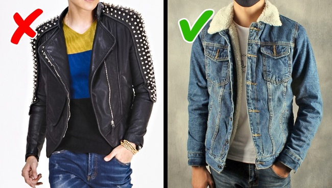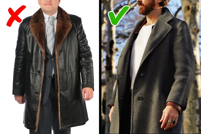 This one’s especially true when talking about coats made of leatherette with a huge leather collar. These coats look old and cheap, and make you look a few years older and several pounds bigger.