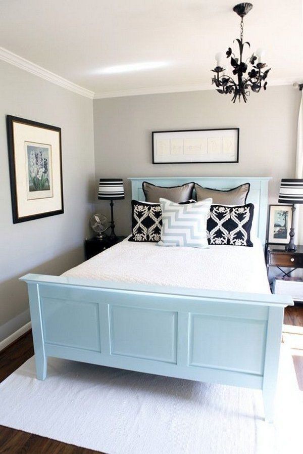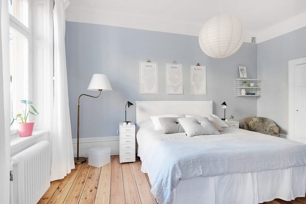 Papel para tapizar y pintura de tonos cálidos y oscuros a primera vista hacen tu dormitorio más acogedor, sin embargo, en realidad precisamente eso es lo que le quita el espacio tan valorado. Decorar el dormitorio con estos tonos solo lo pueden hacer los dueños de una vivienda más espaciosa. Dales preferencia a colores como el blanco, azul claro y gris claro. En lugar de una habitación apretada obtendrás un dormitorio de palacio.