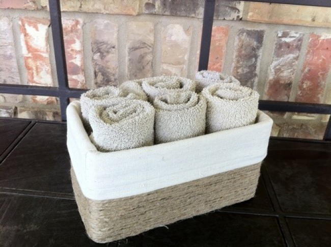 Wrap and glue jute around a tissue box and get the most beautiful vintage accessory for storing washcloths and towels.