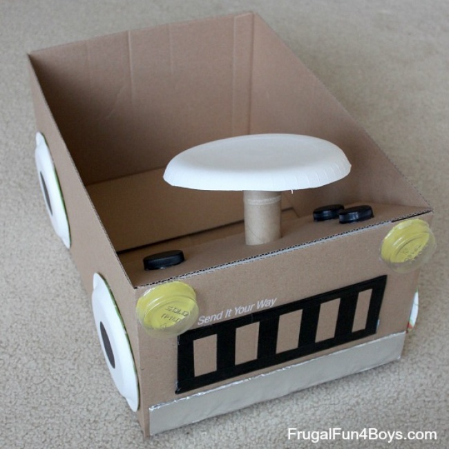 Little boys will be delighted by this cardboard box car with a steering wheel.