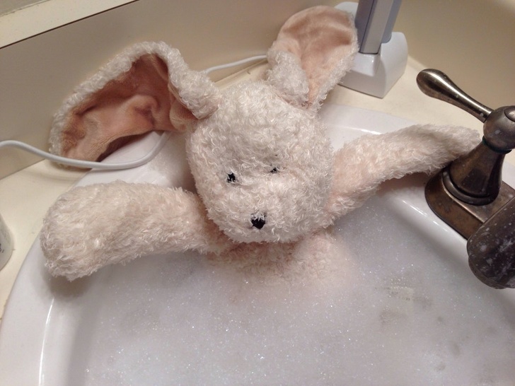 13. “Minha filha perguntou se eu poderia dar um banho no seu coelhinho de pelúcia enquanto ela não estava em casa. Então, lhe mandei esta foto”