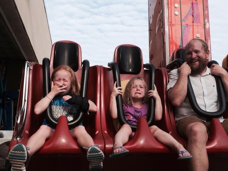9. Este pai levou suas filhas na montanha russa pela primeira vez. Pelo jeito, foi uma ótima experiência…
