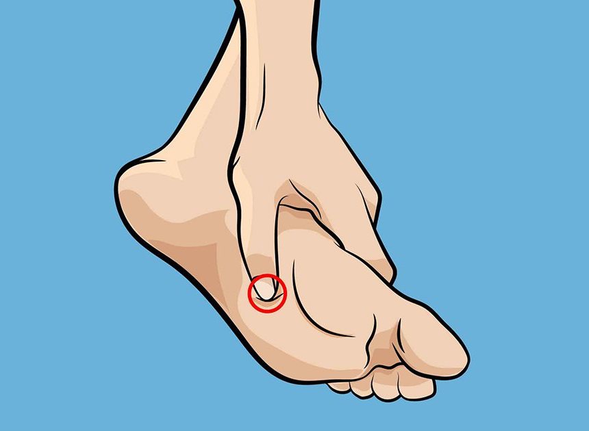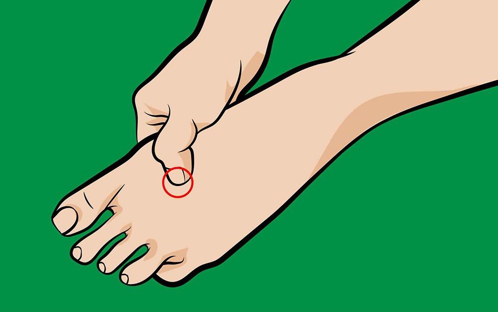 This point sits between your big toe and your second toe. It is about 1.5″ toward your ankle from the base of your toes. This point can be used to relieve headaches, foot cramps, and eye fatigue, and it can even improve concentration. Just press firmly for about a minute.