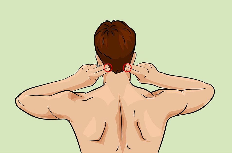 There are two of these points at the sides of the neck, along the base of the skull. Reduce the pressure here for relief from headaches, migraines, and dizziness. Just press in and hold for about a minute.