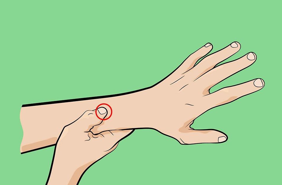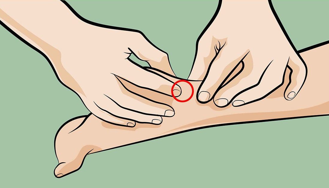 This point is located between two tendons on your wrist, around three fingers’ length down your forearm. Relieving pressure here can stop nausea, vomiting, and motion sickness. Press firmly and massage for about 5 seconds.