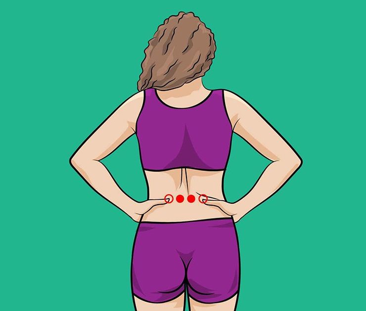 These points fall along your waistline, a couple inches to either side of the spine. Relieving pressure here can help with stomach pain, abdominal pain, and indigestion. Press into each point, one at a time, and hold for one minute.