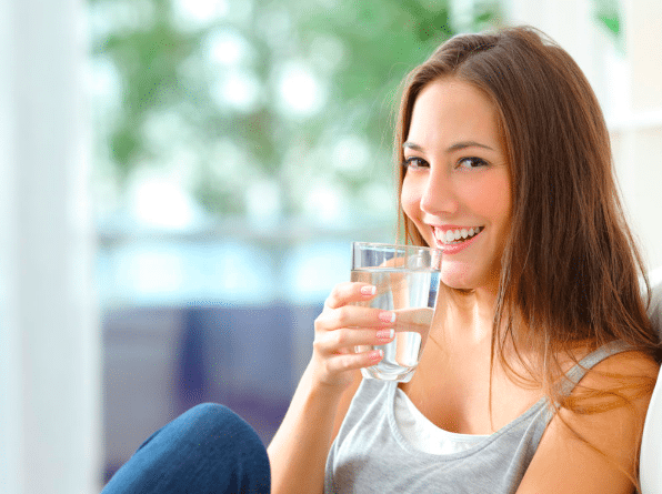 Drinking water helps to flush toxins out of your body. It can help to clear skin, and it can flush out food that may have gotten stuck in your teeth. It will also keep your mouth more moist, so food is less likely to stick there.
