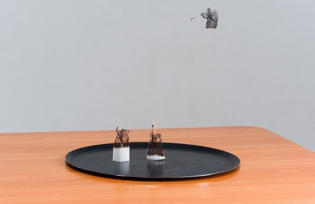 The experiment: Carefully cut the tea bag on one side and pour out the tea. Shape the bag into a cylinder, and then place it on the tray. Our rocket is ready! Light the top of the tea bag and watch it take off!