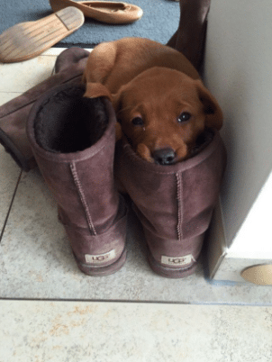 This pup has taken over his owner’s boots, and he doesn’t see the problem with it. It doesn’t look very comfortable, but who are we to judge? Maybe it’s the new sleeping trend.