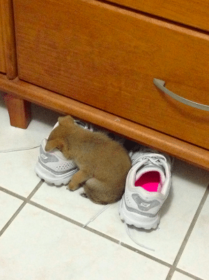 This little guy squished his way in between two shoes. Nothing is more important than finding the perfect sleep spot. Puppies need their beauty sleep too, you know.