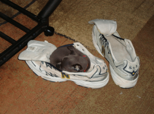 These shoes were wide open, and this puppy took advantage. The foot area seemed like the perfect place to cram his tiny body. Sweetest nap time EVER.