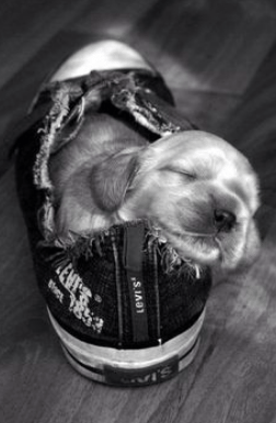 Okay, so this puppy isn’t sleeping on shoes – but this photo was too adorable not to share. Look at his little feet!