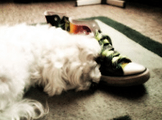 Is it just me, or does this puppy look a little guilty as he nibbles on the shoe? He has turned this pair of tennis shoes into his couch AND his play things. Impressive.