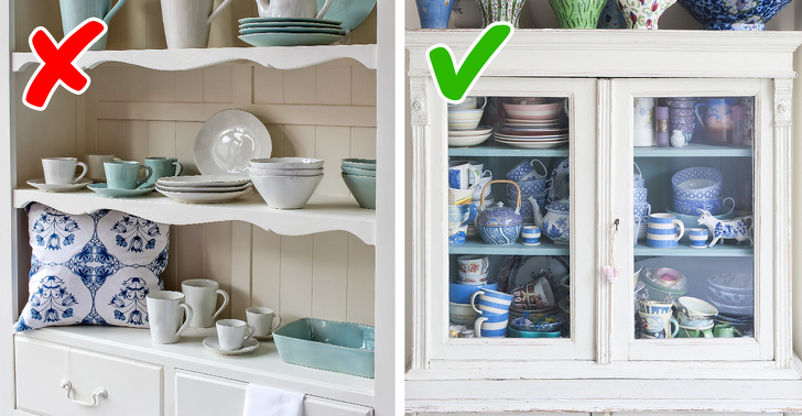 Books, souvenirs, and so on — the more small things there are in your house, the more often you have to dust them. Specialists recommend keeping these things in a glass cabinet — it looks better and it you won’t have to dust it as often. Anything that could get dusty should be kept in a cabinet like this.