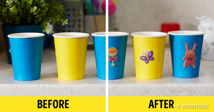 It’s quite hard to find disposable paper glasses with certain cartoon characters. And even if you manage to find them, they usually cost way more than regular glasses. Instead, take paper glasses and put stickers with the characters on them that you can find at any store. Using the stickers, make your own designs on the glasses and suggest your children do it together.