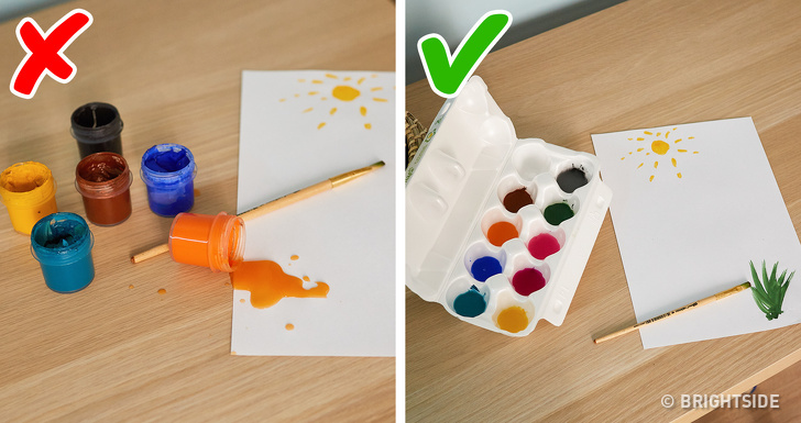 It’s difficult for children to remove extra water from brushes or to mix the colors inside the pots without ruining the original color. A regular pack of eggs can solve this problem: your child can mix the colors in the empty egg carton — it will quickly absorb the extra water from the brush.