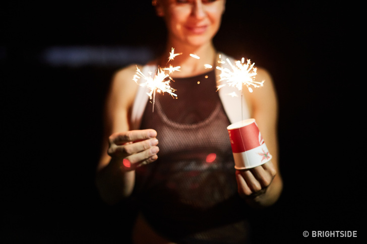 Manufacturers are convinced that it’s impossible to get burned by a sparkler. But children don’t like the sensation of the tiny sparks falling on their skin. In order to avoid the unpleasant sensation, take a paper glass and put a sparkler inside it as the photo above shows.