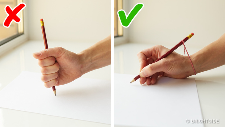Teaching a child to hold a pen correctly is not an easy task. Take a pencil and a simple rubber band. Put the band around the wrist as the photo above shows and let the child practice writing. Don’t substitute the pencil with a pen before the child develops the right skills.