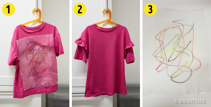 This is a great trick when you need to protect clothes when your child is experimenting with art or cooking. Put some transparent plastic wrap on a T-shirt and iron it from the inside. The wrap will stick to the T-shirt and protect it from dirt or paint. After the child finishes the activity, easily peel off the wrap.