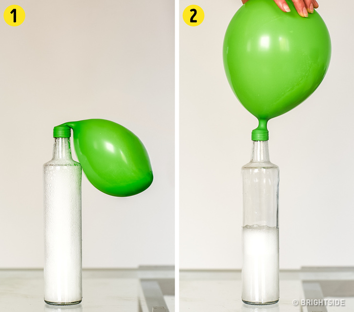 This is a great trick when you need to inflate a lot of small balloons. Take a balloon, put some baking soda inside it and put it on top of some vinegar. The soda will mix with the vinegar and the balloon will start to inflate with gas.