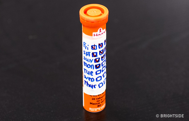 Glue a piece of paper to a medicine bottle and mark a schedule on it with the number of doses that are left. You can teach your children to drink the necessary amount of water every day using the same trick: stick a piece of paper to a bottle so that children can mark the amount of water they drink.
