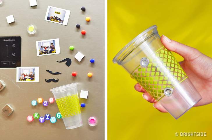Make a glass for a child that they can easily take with them when they feel thirsty. You will need glue and several magnets. Glue the magnets to your child’s plastic glass and attach it to the fridge’s door.
