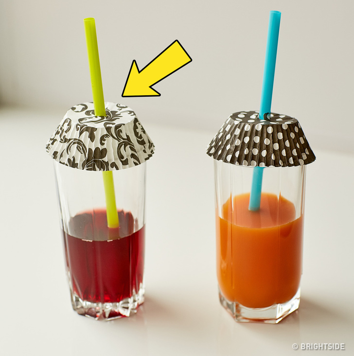 Use coffee filters or small cupcake liners to protect glasses full of sugary drinks from bugs and mosquitoes. And in order to make a glass spill-proof, put plastic wrap on the top and pierce it with a straw.