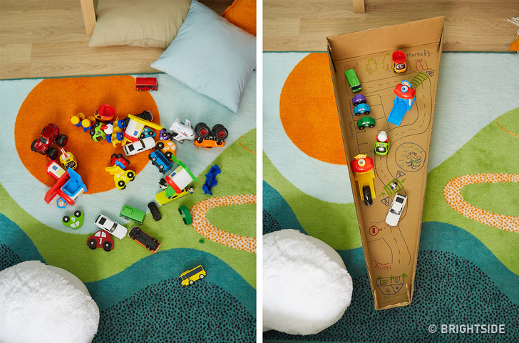 In order not to spend copious amounts of time collecting toys every day, suggest to your child to turn an old box into a playground. Draw a city inside of it with streets and houses for their dolls. When the game is over, it takes just a few seconds to hide the box under the bed.