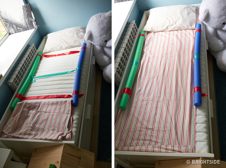 If your child often rolls and falls off the bed, take foam rubber rolls and put them under the sheet. You can use a yoga mat instead of rolls if you’d like. In this case, the sides will be bigger.