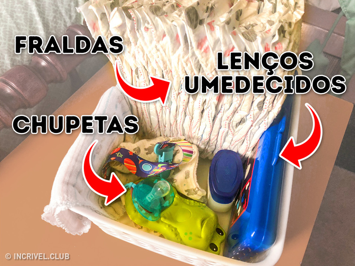 Faça uma pequena cesta de coisas que você precisa para o seu bebê e coloque uma em cada cômodo da casa. Desta forma, você não terá que ir e vir toda vez que ele se sujar e precisar de algum desses materiais.