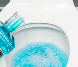 This substance sanitizes and deodorizes your toilet. Pour a little in, brush it around the bowl, and flush.