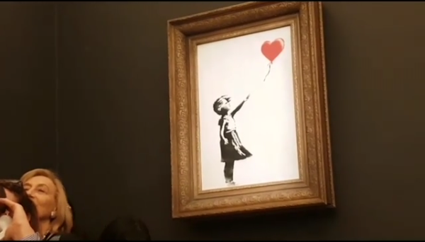 Peintre et réalisateur, l’artiste britannique Banksy est l’un des plus en vue dans le paysage artistique actuel. Ses œuvres sont souvent des commentaires plus ou moins subtils de notre société et ses travers. Girl with Balloon est l’une de ses images les plus connues. Une reproduction était justement mise en vente chez Sotherby’s, une importante maison de ventes aux enchères basée à Londres.