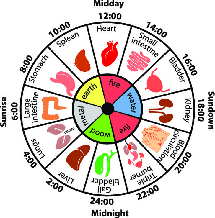 The Chinese Organ Body Clock assumes that Qi circulates through the twelve principal meridians in your body related to certain internal organs. This cycle usually takes 24 hours while each of your body’s systems are given 2 hours of Qi charge time.