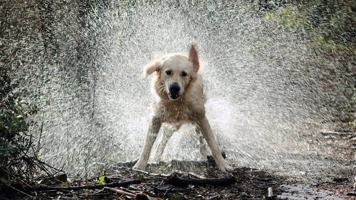 Before bringing wet dogs inside, dry them off for a few minutes with a hairdryer in your garage or mudroom. Wet dog isn’t a pleasant smell, and pups have the tendency to track water and mud on carpets and furniture. They’ll probably even enjoy the nice warm air on their fur.