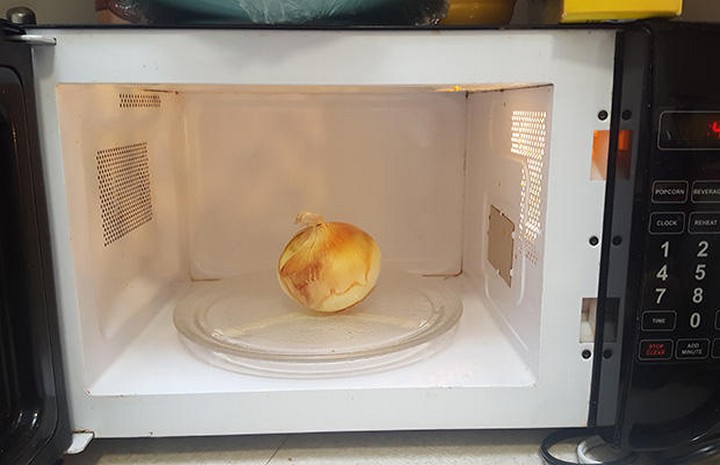 Simply cut off the ends and place your onion in the microwave on full heat for 30 seconds. It does warm the onion a little bit but not having to deal with stinging, teary eyes is worth it!